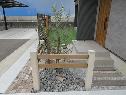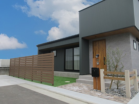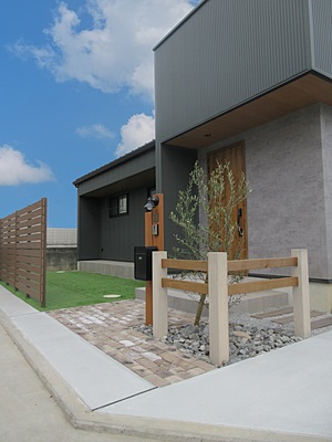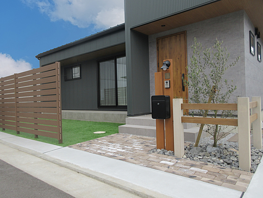 シックなモトノーンを基調とした建物に合う、ヴィンテージ風レンガを敷詰め、アクセントにファームフェンスを使用し、空間を仕切り、ナチュラルモダンを演出出来ました。