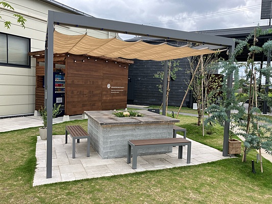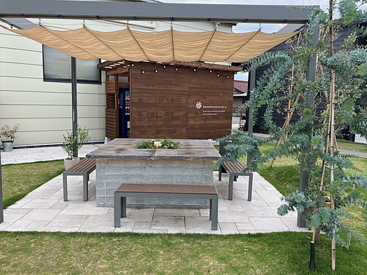 波多野工務店でお客様にご来場いただき、イベントの会場でもあるスタジオです。TOYOの商品と緑、植栽をたくさん使用してご好評をいただいています。
