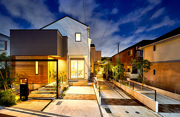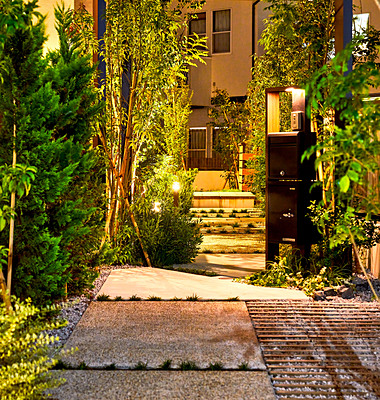 第31回全国施工写真コンテスト ペイブマテリアル部門 入選作品詳細はこちら[施工のポイント]カースペースのアクセントと、ポーチ階段の踏面、テラスにカルムぺイブを使用し、デザインに統一感を持たせました。とくに、ポーチ階段部分は蹴込部分に化粧砂利を入れ込み、カルムぺイブを蹴上面よりすこしチリを出すことで浮遊感を演出しています。緑化の必要な地域のため、緑も多く植えこんでいるため、敷縁部分の号棟は玄関までのアプローチは緑の小道を歩くような演出をしています。
