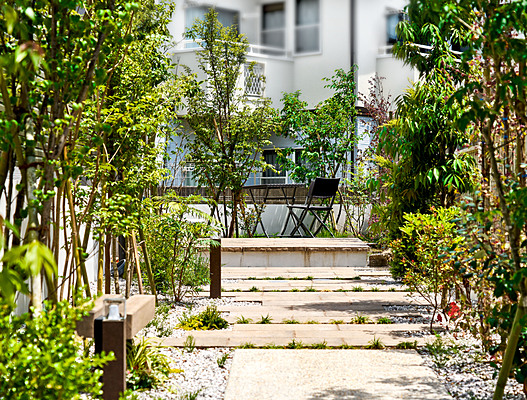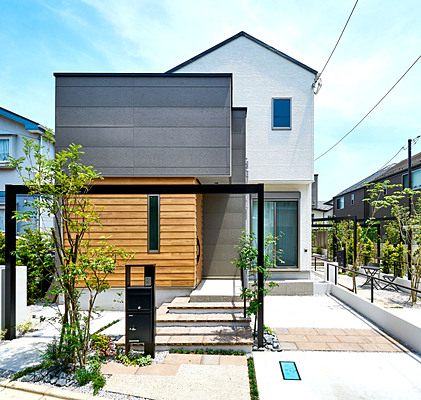 カースペースのアクセントと、ポーチ階段の踏面、テラスにカルムぺイブを使用し、デザインに統一感を持たせました。とくに、ポーチ階段部分は蹴込部分に化粧砂利を入れ込み、カルムぺイブを蹴上面よりすこしチリを出すことで浮遊感を演出しています。緑化の必要な地域のため、緑も多く植えこんでいるため、敷縁部分の号棟は玄関までのアプローチは緑の小道を歩くような演出をしています。