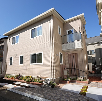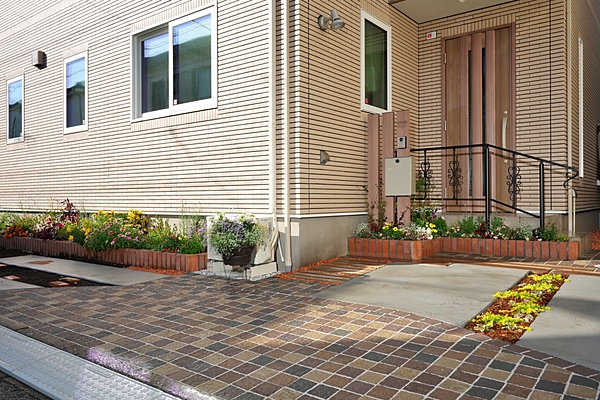 ボルドキューブの愛らしさを活かして、アプローチと駐車場に大胆な曲線を取り入れたデザインとしました。全色をバランスよく配色し、明るい駐車場とアプローチとしました。途中途中にヴィンテージウッドぺイブをいれ、ナチュラルな雰囲気をとりいれ、変化をもたせました。