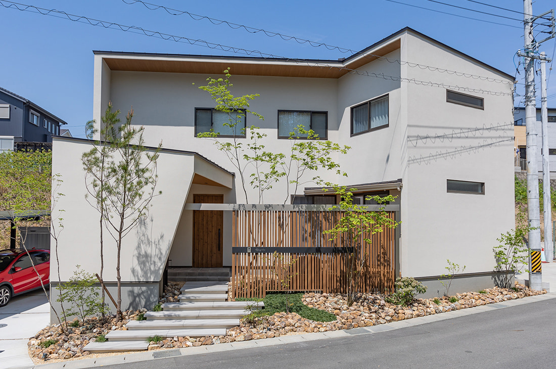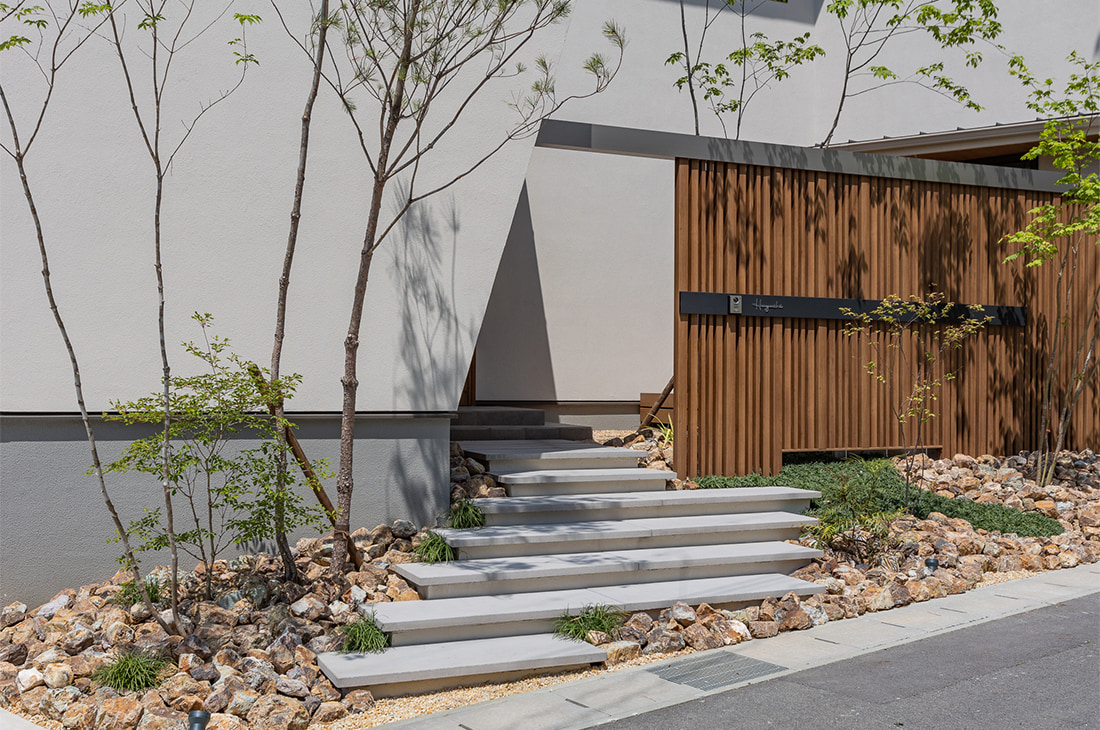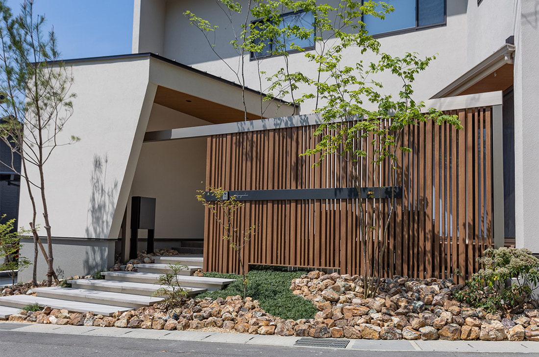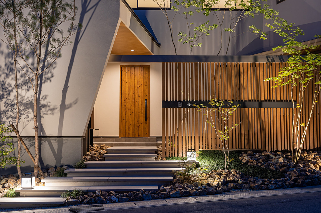 - 建築と外構を一体的に捉えた計画性の高さが際立つ作品です。和モダンの塗り壁と格子が織り成す端正なファサードに、ニュートペイブの素朴な質感が調和し、街並みに溶け込みながらも気品ある佇まいを創出しています。雑木の植栽や浮遊感あるステップが生み出す陰影は時間とともに変化し、夜間のライティングで映し出される樹影の美しさも格別です。外部と内部、光と素材、静と動を丁寧に結びつけた“暮らしに寄り添う外構”として、総合的な完成度の高さが際立つ作品です。