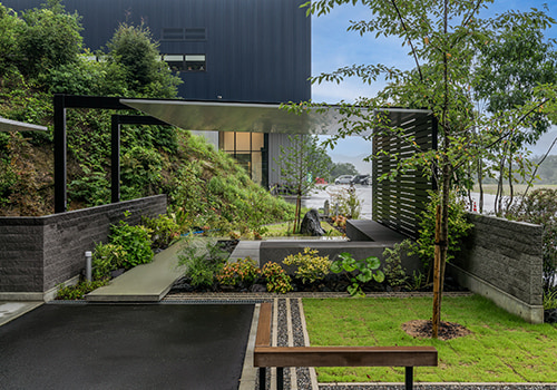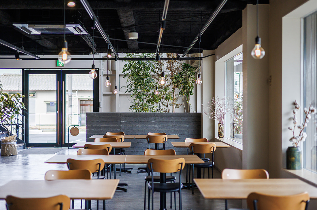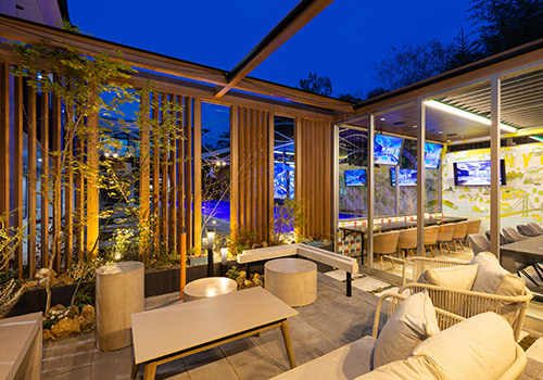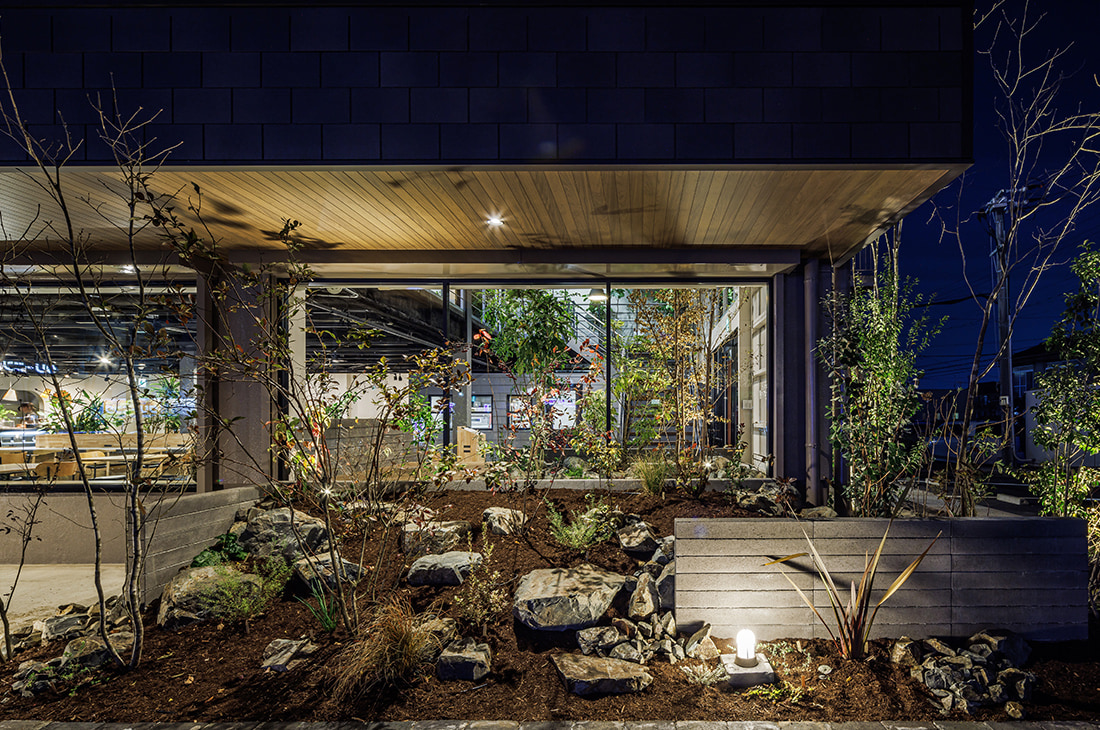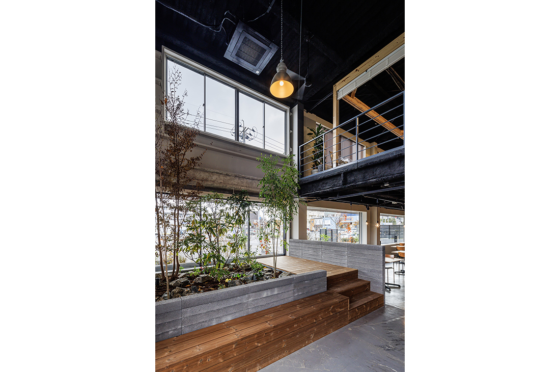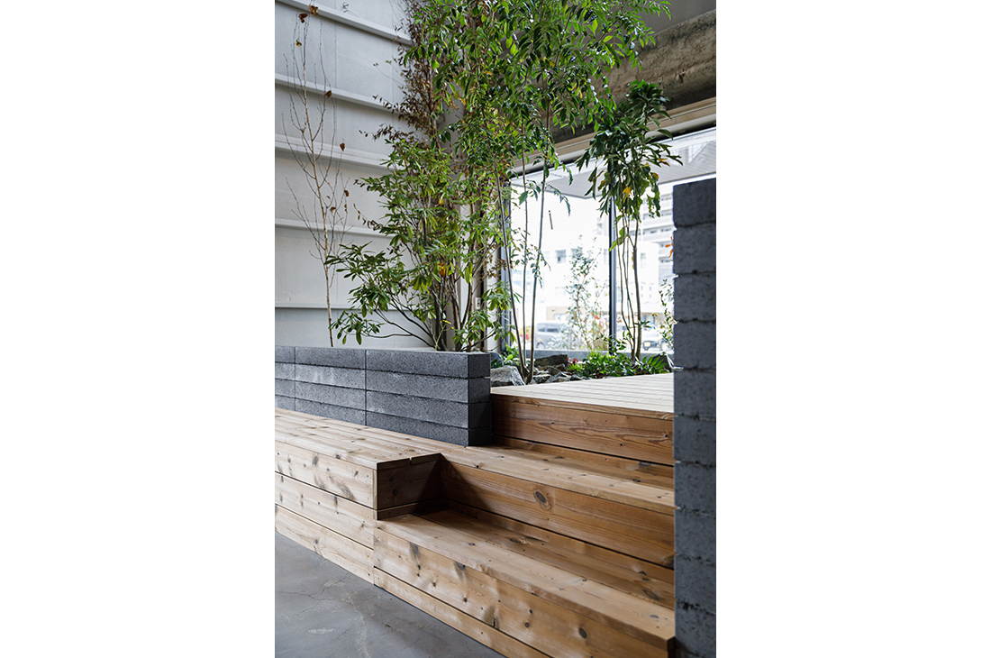 - 居心地の良い空間づくりのため 屋内に植栽をもうけています。ウッドデッキの背面にはモデリート 客席とのパーティションとしての役割を持つ壁にもモデリートを使用しています。グレー・木目・ブラックが基調となった空間と植栽になじむ素材と色合いを選びました。また屋外の植栽の土留めとしても一部モデリートを使用しており 屋外と室内のつながりを感じられる空間をつくっています。