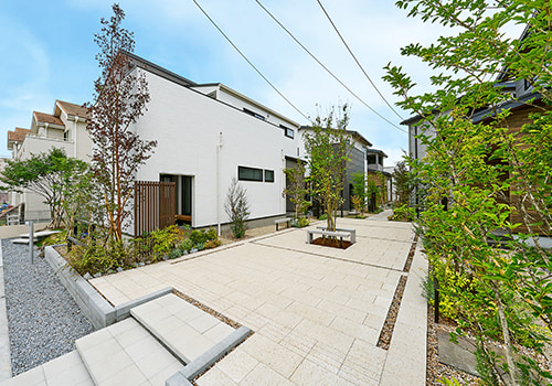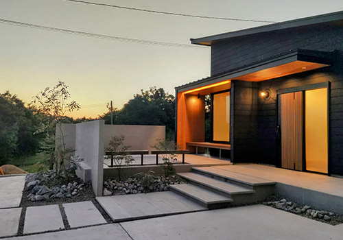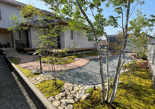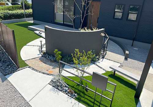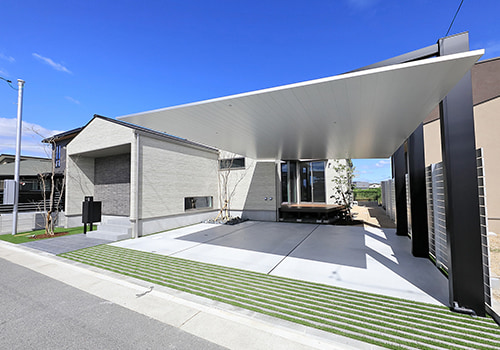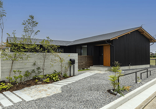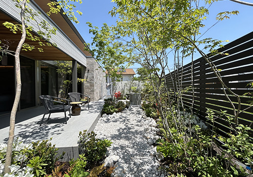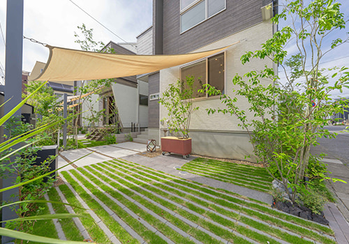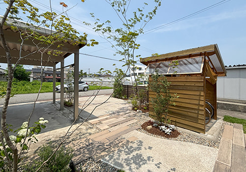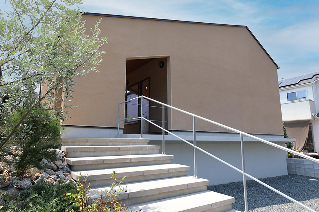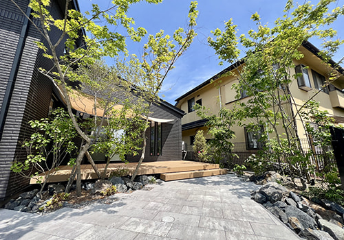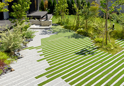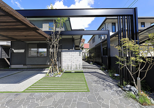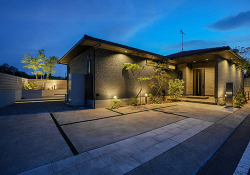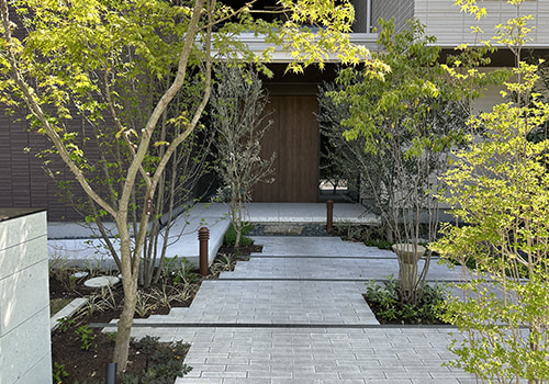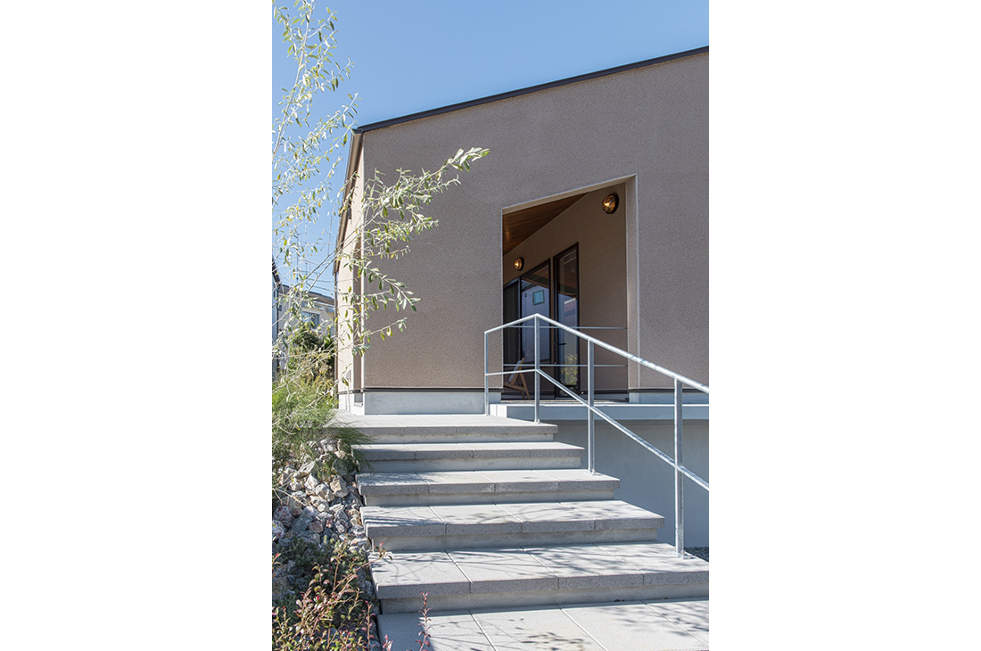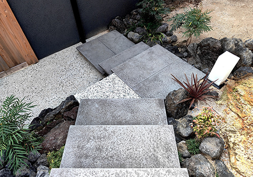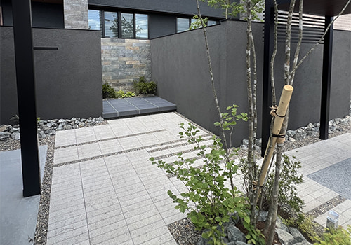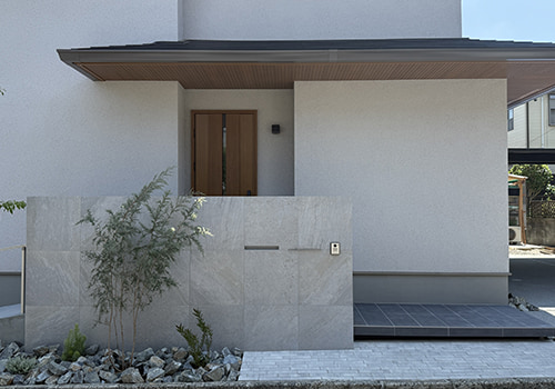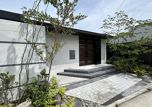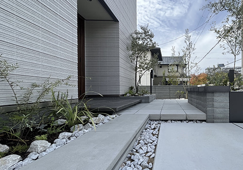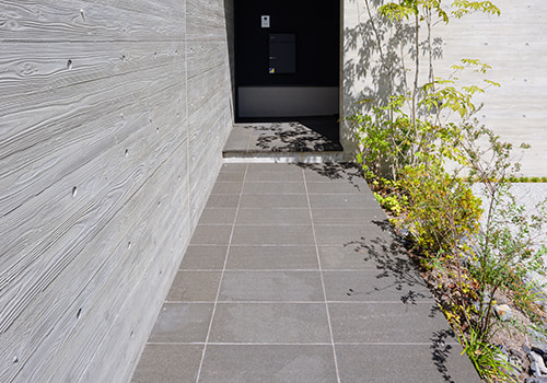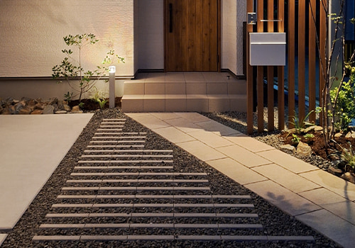 - 建築の内と外を繋げる気持ちの良い空間のある住宅を目指し設計いたしました。道路より高い敷地条件を活かし、幅広で緩やかな外階段を設けました。ここに、ドゥ―ステップ(GB)を採用し、ロックガーデンや自然素材の外壁と調和するアプローチを実現しています。玄関ポーチはポルドキューブ(ポルドグレー/ポルドダーク)を床仕上げとし、空間に落ち着きを演出いたしました。昼間は植栽の緑と石材の質感が爽やかなコントラストを生み、夜には照明が石畳をやわらかく照らし出し、訪れる人を温かく迎え入れます。四季折々の植栽の彩りとともに、日常の中で豊かさを感じられる住まいとなりました。
