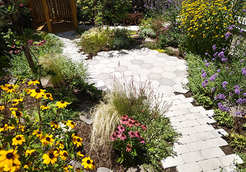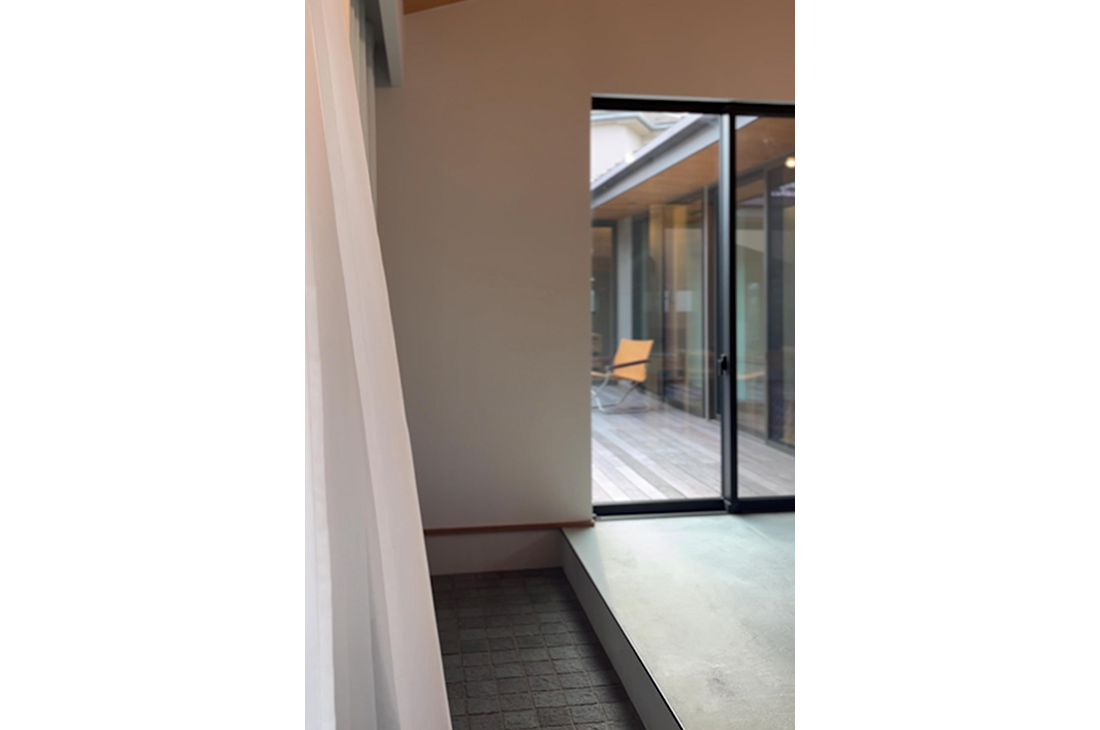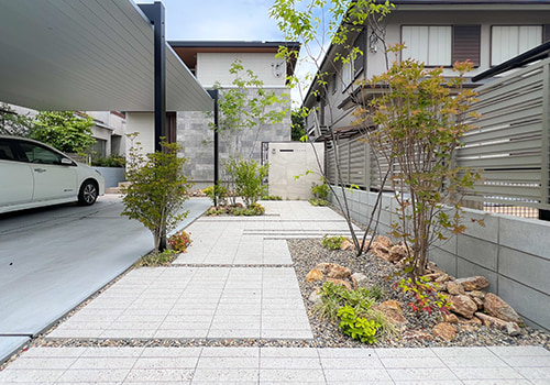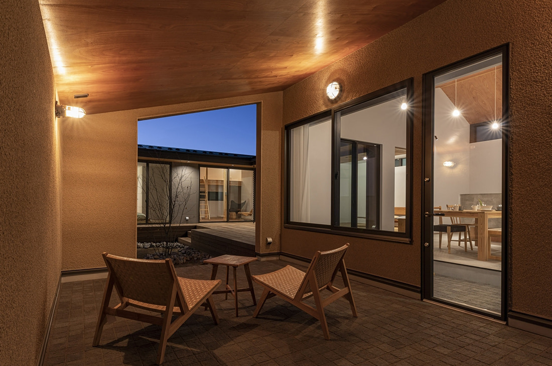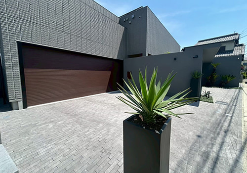 - 屋外舗装材であるポルドキューブを半屋内の中庭や土間にまで展開し、内と外をシームレスにつなぐ新しい使い方を実現した点が印象的です。落ち着いた色調が空間に深みをもたせ、昼夜で変わる光の表情も美しく引き立ちます。さらに、敷地の高低差を豊かさへと転換した外階段計画も秀逸で、ドゥーステップがロックガーデンと調和しながら住まいへ続く動線を端正に導いています。植栽との連携も巧みで、四季とともに暮らす上質な外構として魅力がよく伝わってきます。