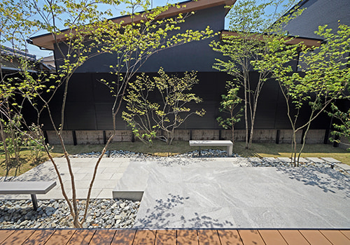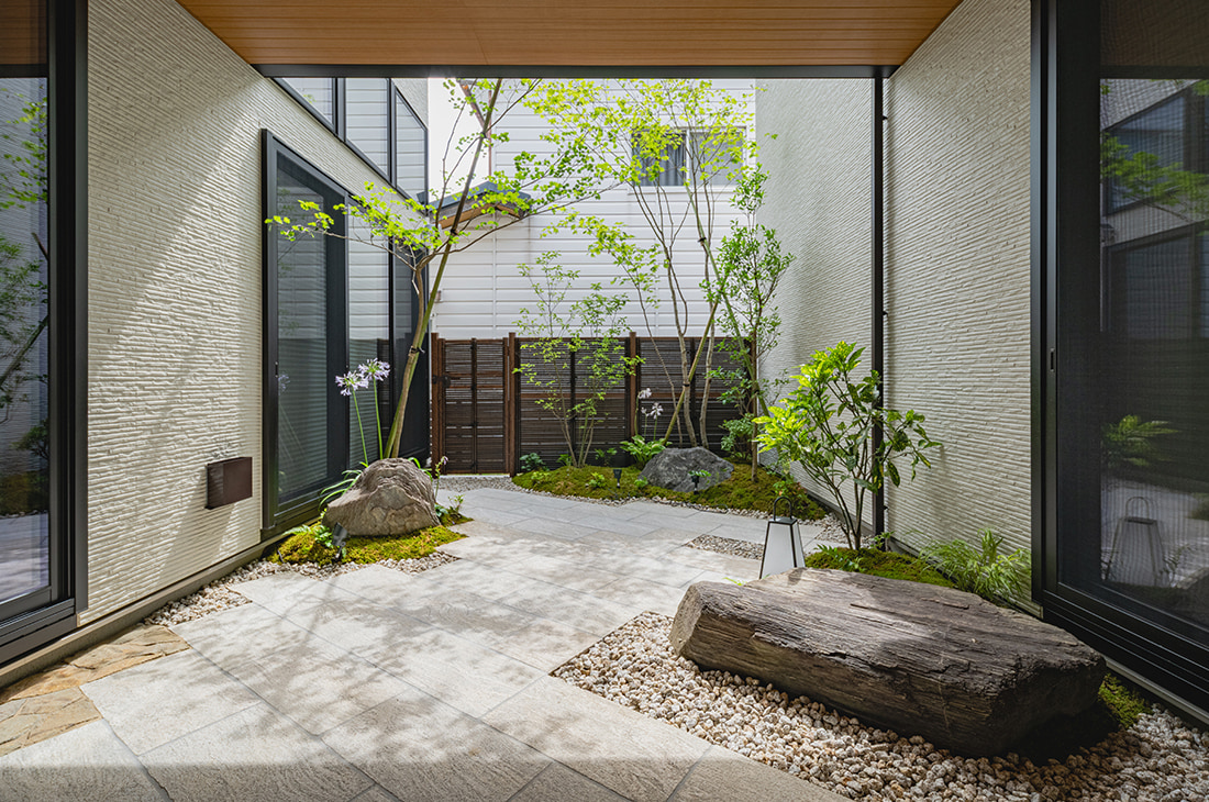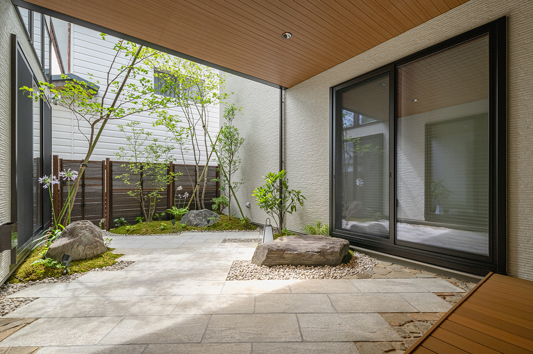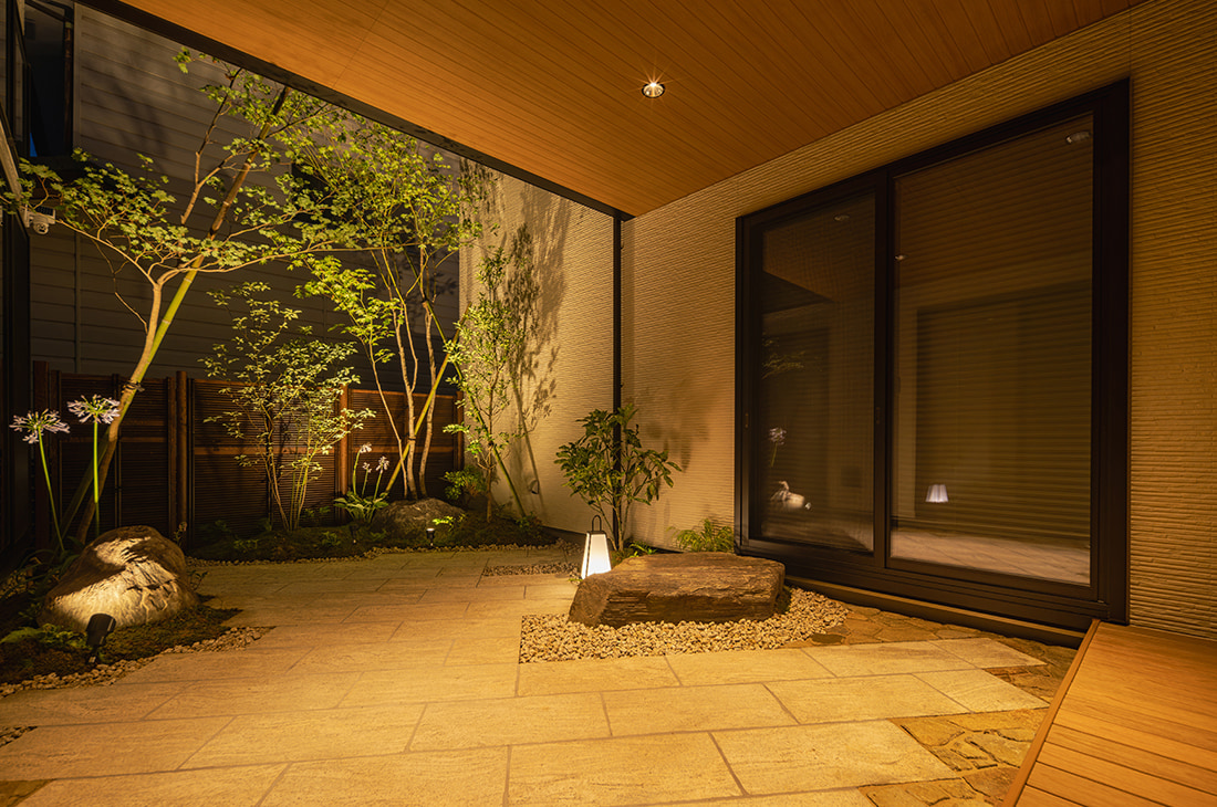 - 天然石「マレアストーン」を贅沢に採用し、自然が生み出す豊かな色調と凹凸感が空間に深みを与えます。高い耐久性と防滑性を備え、日常の安全性にも配慮。目地幅を均一に整える精緻な施工と、植栽・ライティングの計算された配置により、昼は上質な自然美、夜は幻想的な趣を楽しめる癒しの中庭を実現しました。