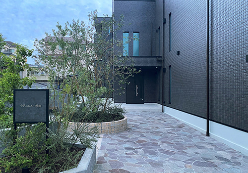 - 天然石ならではの色幅と凹凸感が空間に深みを生み、昼夜で表情を変える魅力的な中庭を演出しています。精度の高い目地調整や植栽・照明の緻密な計画により、落ち着きのある中に“自然のゆらぎ”を感じる上質な空間を創出。素材の価値を丁寧に引き出した施工が、空間の質を一層高めています。