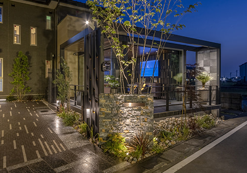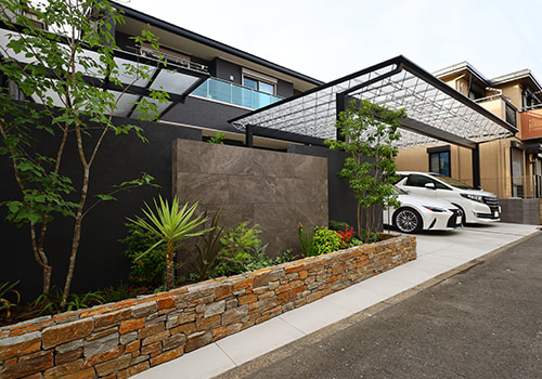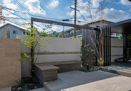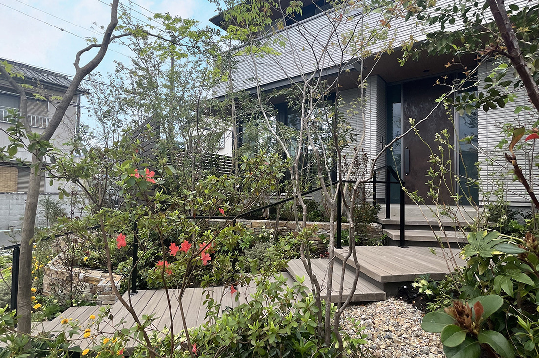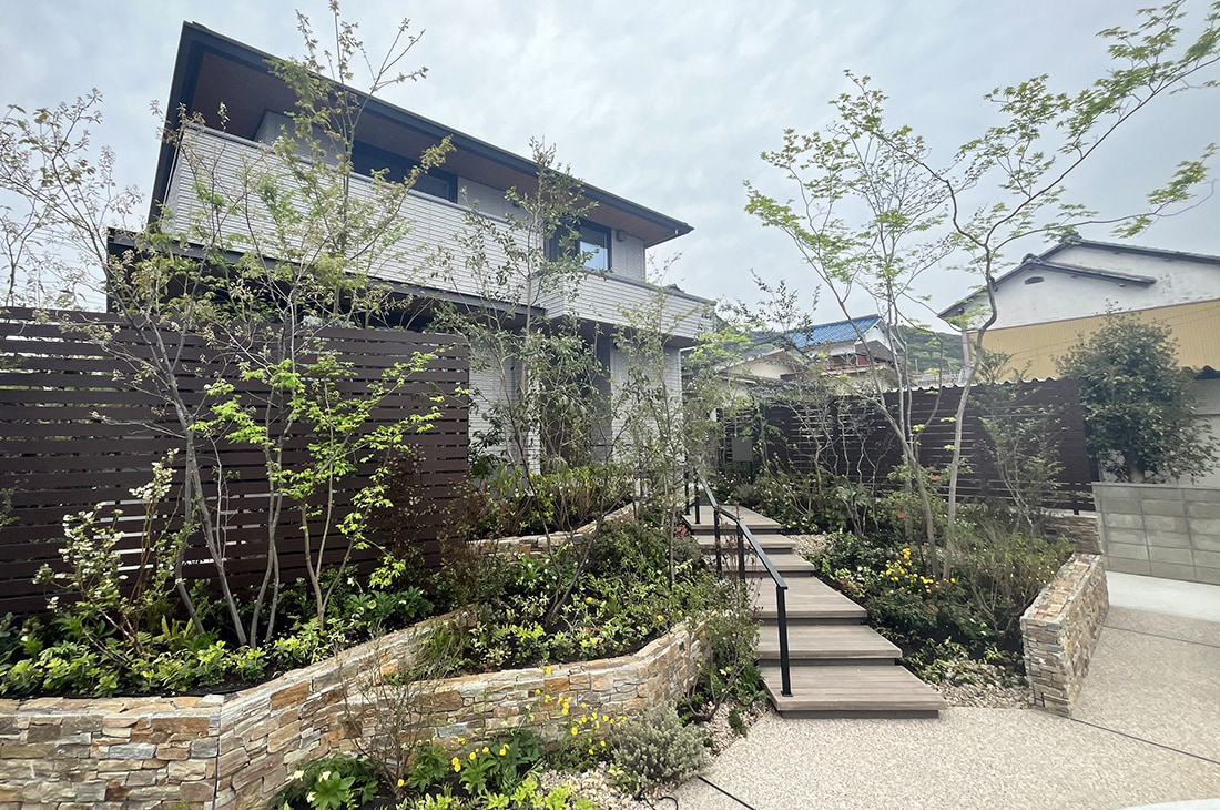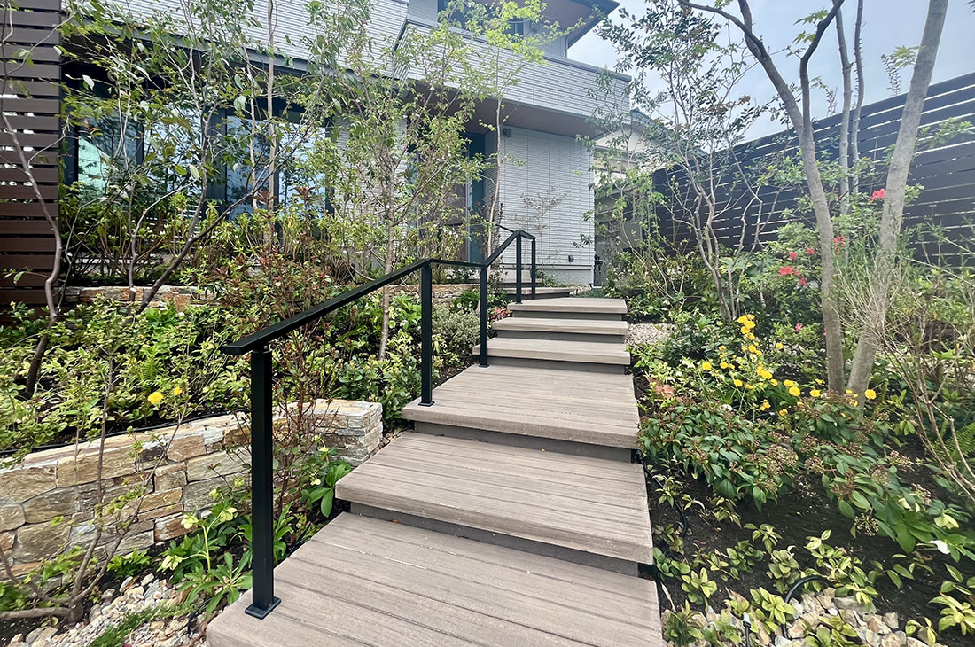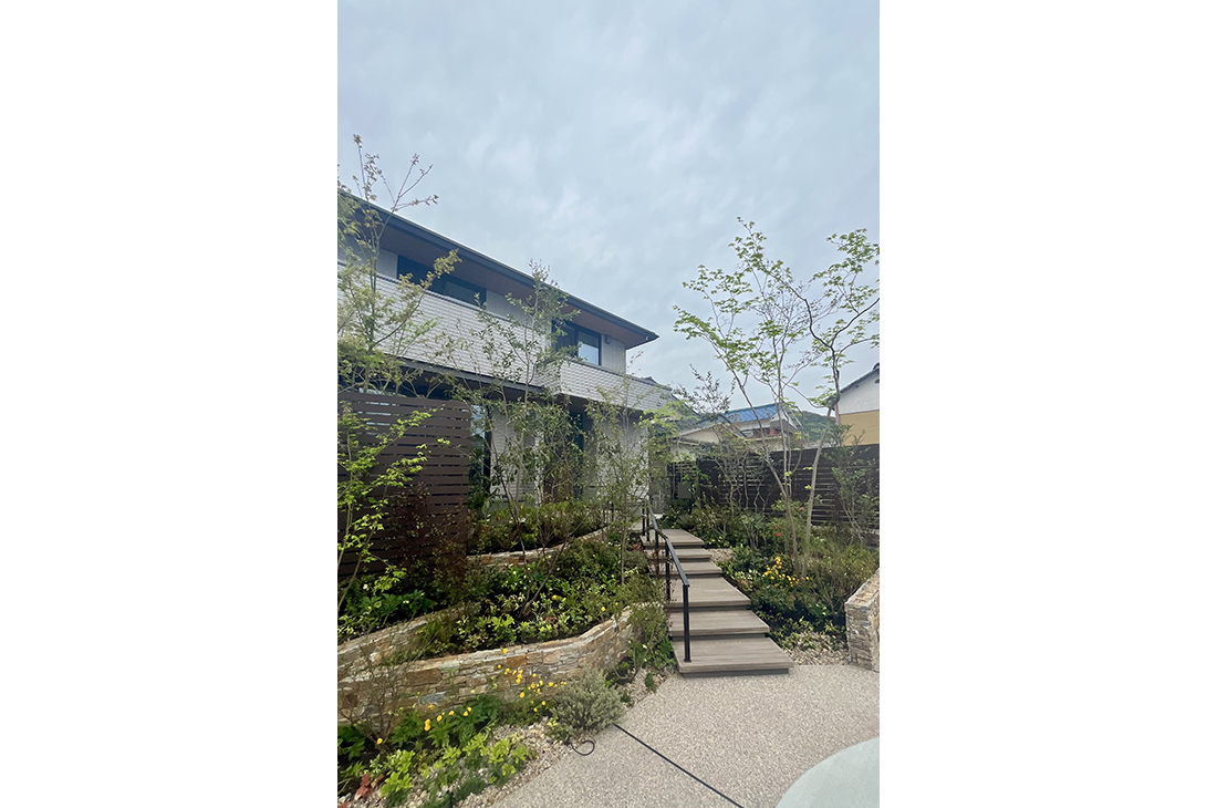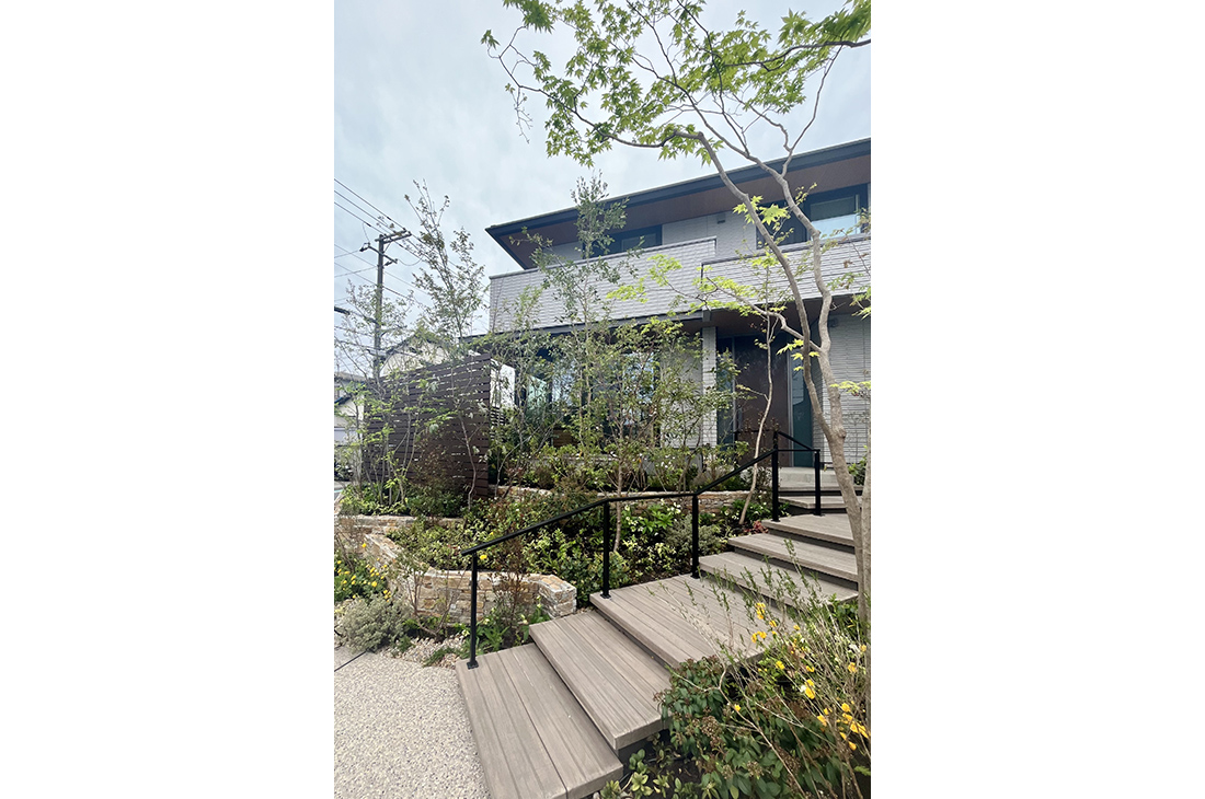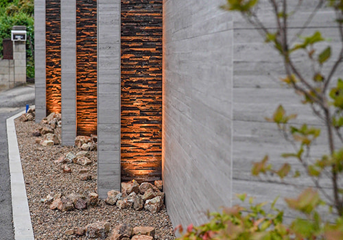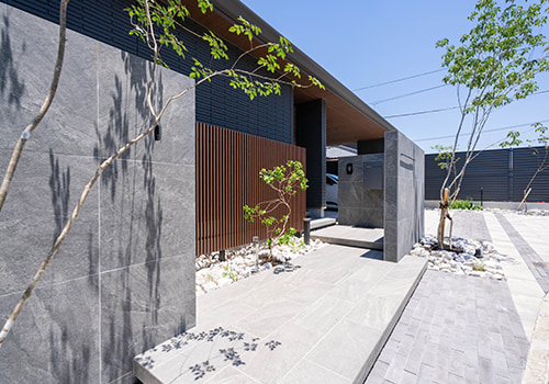 - 木立を抜けるアプローチと高さを巧みに変化させたロッツプレートの構成が見事に融合し、敷地の高低差を魅力に変えた秀逸なデザインです。自然石と地被植物が足元に豊かな風景をつくり、歩くたびに景色が移り変わる“散策性のあるアプローチ”を実現。ロッツプレートの重厚で自然な質感が、建物の風格を引き立てています。