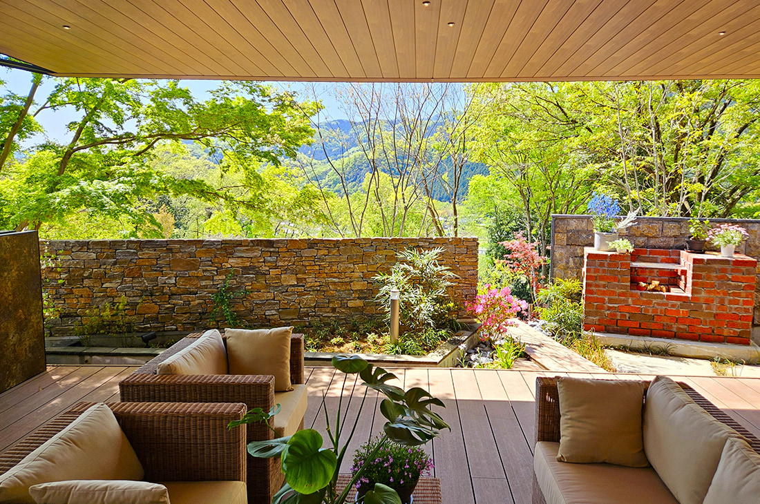 - 山の稜線と緑に囲まれたプライベート空間。本来ならば人の暮らしが見える場所。現実の風景をロッツプレートウォールで巧みにそっと隠し、望む景色だけが映るよう施工しました。ここは日常の喧騒から離れた、森の中の隠れ家。溶岩が流れるような荒々しさを表現したBBQ 炉のゆらめく炎と調和し、自然の力強さとあたたかな時間を引き立てます。