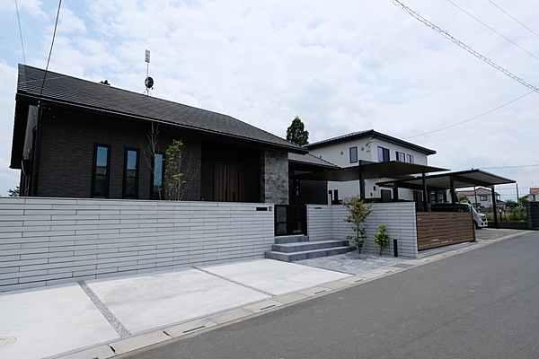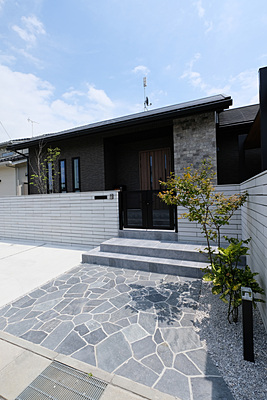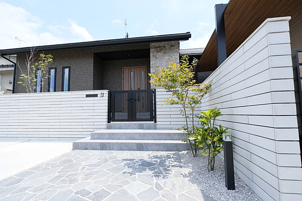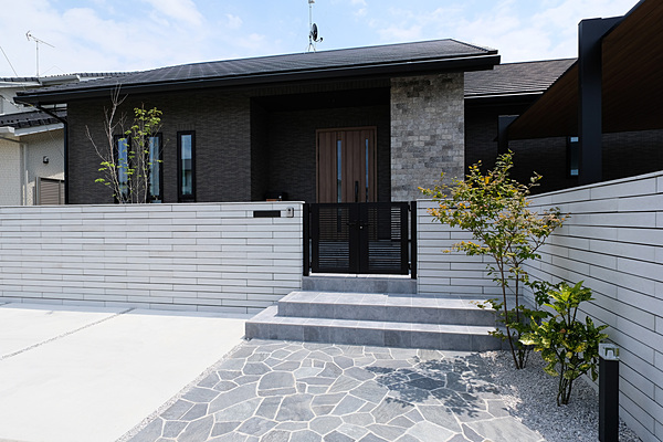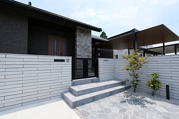 色に関してはホワイトとダークトーンのメリハリを意識してデザインしました。横長なブロックを高く積み上げる事で圧迫感を出さずに重厚な石材の高級感が醸し出されて、クローズスタイルのデザインとの相性が良いと思います。