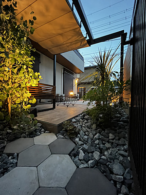 第31回全国施工写真コンテスト ペイブマテリアル部門 入選作品詳細はこちら[施工のポイント]タイルテラスから植栽帯へのアプローチに、デザイン性のある平板を使用し、細かいところもこだわって設計しました。