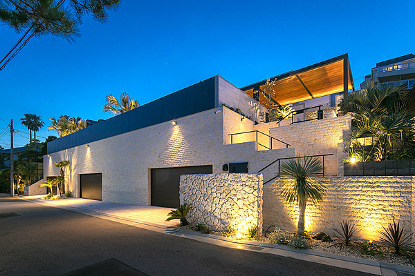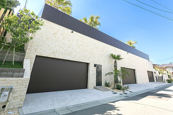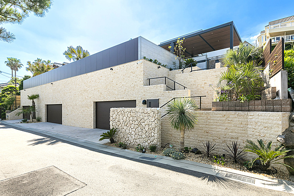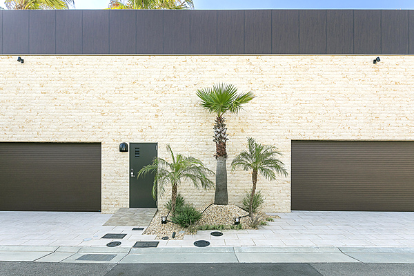 第31回全国施工写真コンテスト ペイブマテリアル部門 入選作品詳細はこちら[施工のポイント]家族や友人と自宅で過ごす時間を大切されるお施主様。新築外構でご相談をいただきました。お出かけすることなく自宅で思いっきり楽しめるリゾートガーデンをご希望。広々とした敷地には、プール、サウナ、BBQを楽しめるアネックスを用意。目隠しもしっかりされた守られた空間で安心して特別な時間を過ごすことができます。駐車スペース土間には、300x600のカルムペイブで仕上げています。植栽には、ソテツ、ココスヤシを使用。カルムペイブとの相性もよく、高級感のある佇まいに圧巻されます。