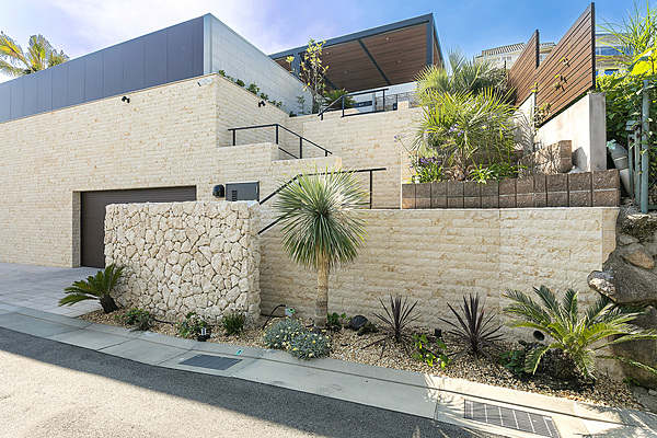 家族や友人と自宅で過ごす時間を大切されるお施主様。新築外構でご相談をいただきました。お出かけすることなく自宅で思いっきり楽しめるリゾートガーデンをご希望。広々とした敷地には、プール、サウナ、BBQを楽しめるアネックスを用意。目隠しもしっかりされた守られた空間で安心して特別な時間を過ごすことができます。駐車スペース土間には、300x600のカルムペイブで仕上げています。植栽には、ソテツ、ココスヤシを使用。カルムペイブとの相性もよく、高級感のある佇まいに圧巻されます。