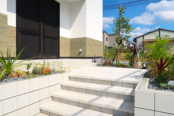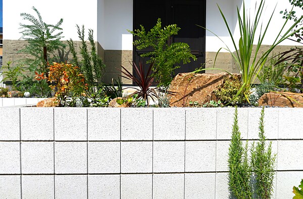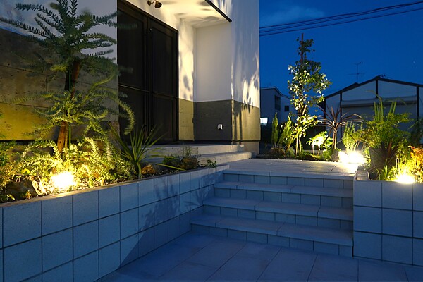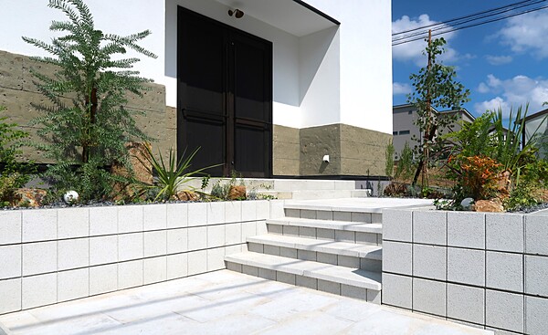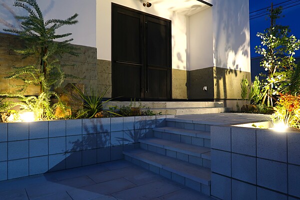 ”お客様が植物を楽しみながらご来店できる外構をコンセプトに作りました。アプローチ入口右側に1つ、基礎を隠すように正面に1つ、そして店舗扉の脇に計3か所植栽スペースを作りました。階段を歩きながら、植栽を見る目線の高さが変わり、歩く位置によって植栽を楽しめるような設計になっています。店舗のため、清潔感が保てるようにブロックは、防汚加工が施されているドゥー・ロックにしました。また、床面は高級感がでるようにダルストーンを敷いています。夜は、パスライトに照らされた植栽の影が、家の外壁だけではなく、ドゥー・ロックの壁面に出るのもおもしろいポイントです。