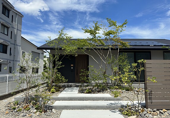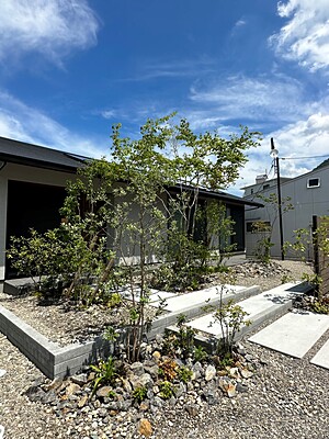設計様のご意向で、門柱や花壇部分で使用するモデリートをあえて土留め+ステップとして新しい用途で使用頂きました。今まではCBでの土留めやドゥー・ステップを採用していた所が、モデリートを使用する事で横への広がりや植栽の調和が取れています。