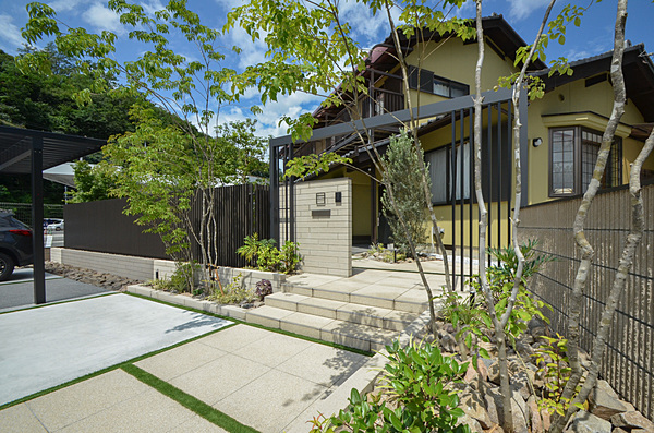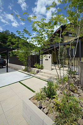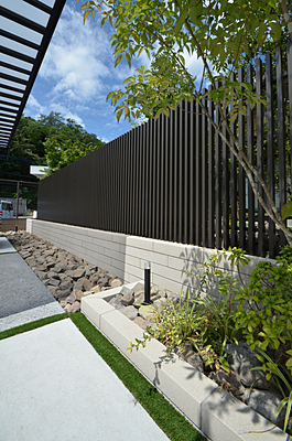 自営業の関係でほとんどが駐車スペースになっていた敷地をリノベーションを行った事例です。交通量の多い前面道路からの視線を遮りながらも風の通る仕切り壁をブロック塀と縦格子フェンスで設計しました。スレンダーウォールのスタイリッシュな形状がデザイン性を高めていると感じます。