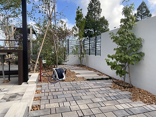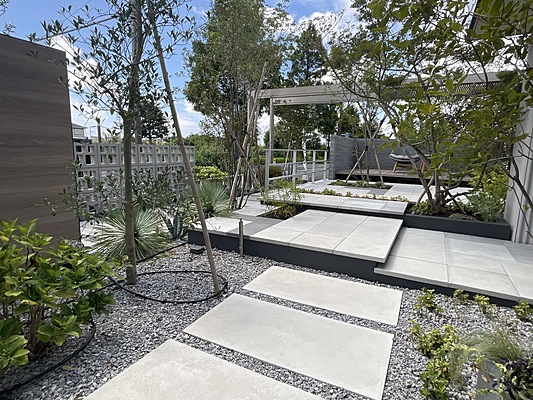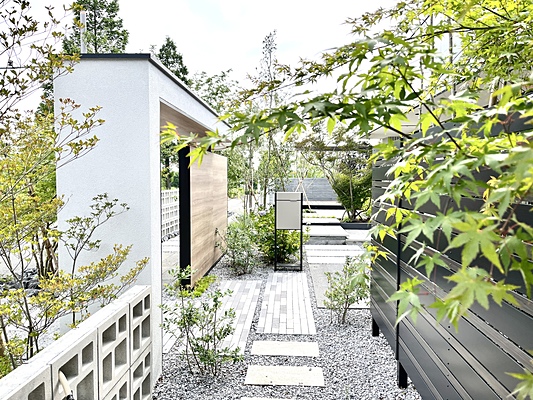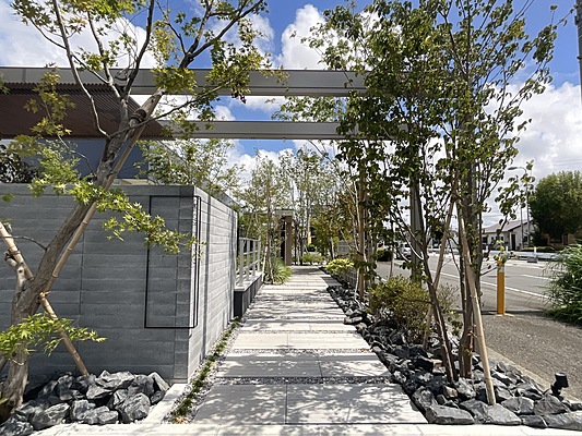 第31回全国施工写真コンテスト ペイブマテリアル部門 入選作品詳細はこちら[施工のポイント]エッジの利いたデザインのアイテムを取り入れ、コンクリート調の色味ともマッチしたスタイリッシュな展示場に仕上がりました。無機質な床材と植栽や自然石のコントラストが美しく、より緑を際立させています。