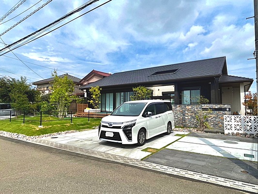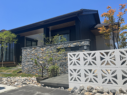 第31回全国施工写真コンテスト プレートマテリアル部門 入選作品詳細はこちら[施工のポイント]門まわりに重厚感を演出したくロッツプレートで幅の広い袖壁を造作しました。全体を通してナチュラルなイメージになるよう自然石や枕木を組み合わせております。