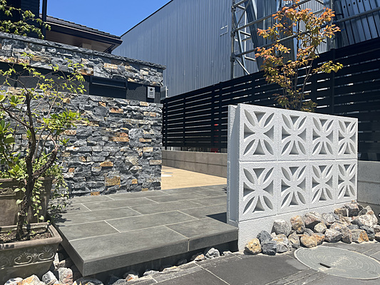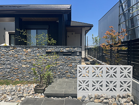 門まわりに重厚感を演出したくロッツプレートで幅の広い袖壁を造作しました。全体を通してナチュラルなイメージになるよう自然石や枕木を組み合わせております。