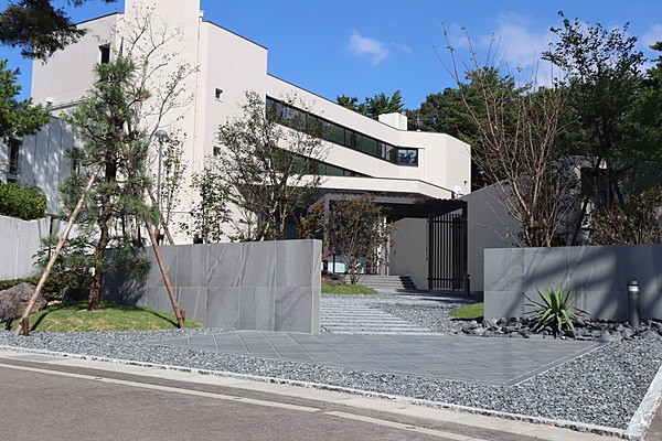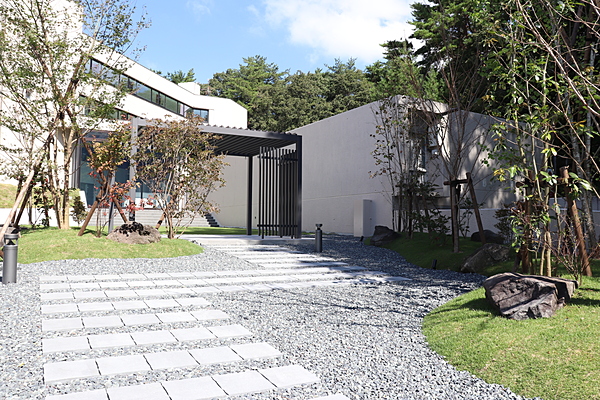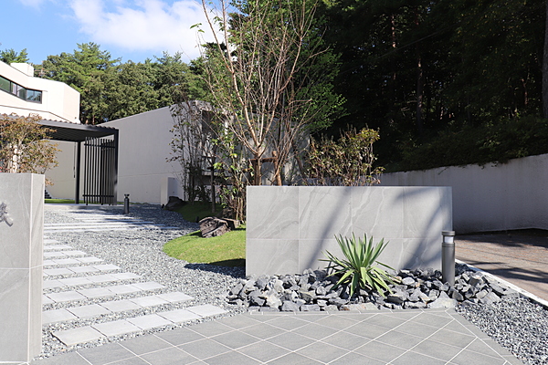 保養施設の一部スペースを庭園として新たにリニューアルする計画でした。お施主様からのご要望として、内外から庭園を見て楽しめること、庭園自体を使って楽しめることを求められました。一番目に留まりやすい箇所に和石を使用することで、シックでありながら有機的な印象をもたらすことができました。また庭園内にカルムペイブを敷設し、植栽を間近で感じ楽しめるようにしました。