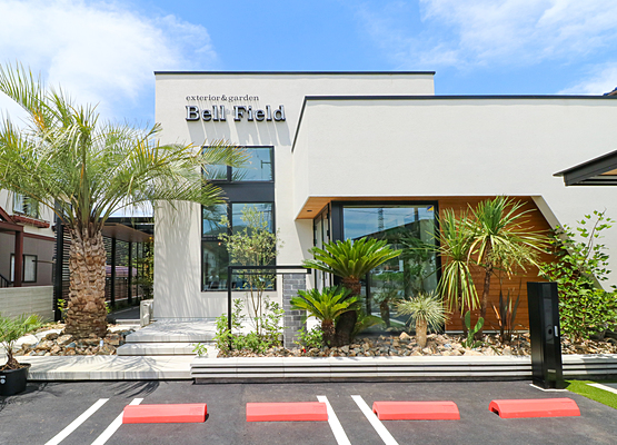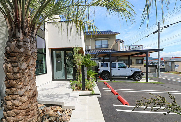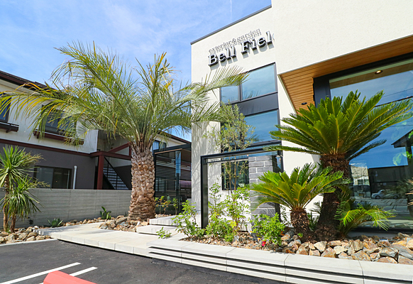 第31回全国施工写真コンテスト ペイブマテリアル部門 入選作品詳細はこちら[施工のポイント]ニュートステップ、ニュートペイブの厚みの違うマテリアルを組み合わせ、店舗正面のアプローチ階段と花壇をデザイン。ニュートアッシュの無機質なテクスチャーとココスヤシやアガベ、割栗石がよく合い、モダンな西海岸スタイルの雰囲気をより出してくれます。また、花壇に使用したニュートペイブの隙間は太めにとった黒モルタルを使用し、モノトーンな色合いの中でメリハリをつける工夫もしました。お客様が理想の庭をつくっていく上で「こんな雰囲気のお庭にしたい!」と想像を膨らませてもらえるような住宅としてのリアルさに気を付けて計画しました。