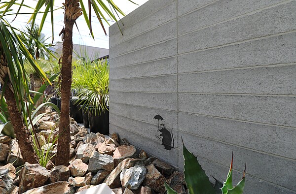 ニュートステップ、ニュートペイブの厚みの違うマテリアルを組み合わせ、店舗正面のアプローチ階段と花壇をデザイン。ニュートアッシュの無機質なテクスチャーとココスヤシやアガベ、割栗石がよく合い、モダンな西海岸スタイルの雰囲気をより出してくれます。また、花壇に使用したニュートペイブの隙間は太めにとった黒モルタルを使用し、モノトーンな色合いの中でメリハリをつける工夫もしました。お客様が理想の庭をつくっていく上で「こんな雰囲気のお庭にしたい!」と想像を膨らませてもらえるような住宅としてのリアルさに気を付けて計画しました。