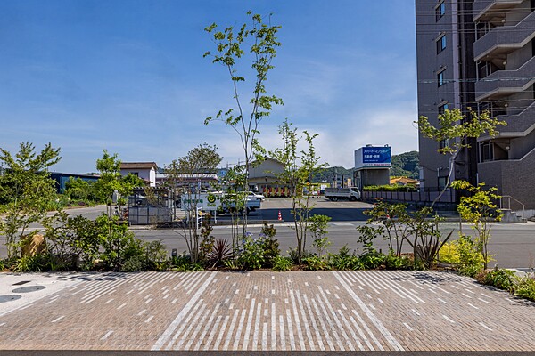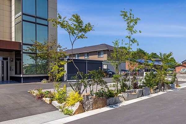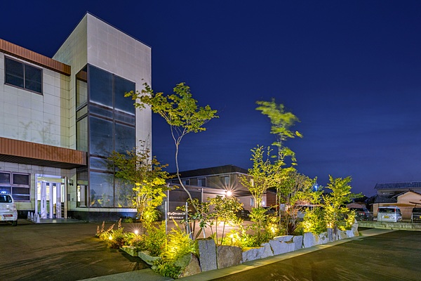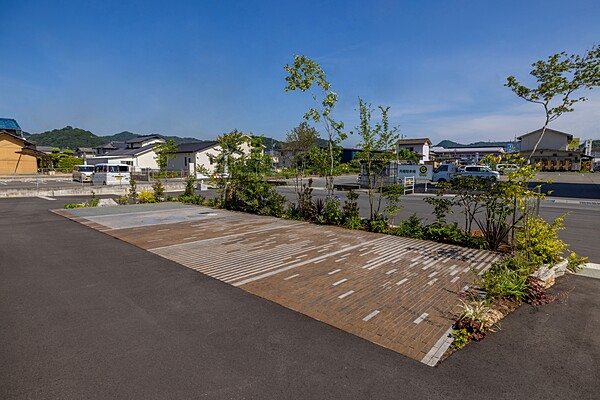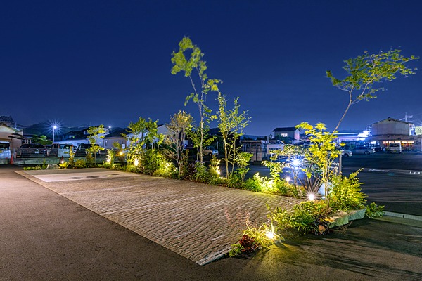 元々は広かった企業様の駐車場でしたが、道路拡張によりスペース縮小となったのを機会に、リニューアルしました。基本的にアスファルト舗装の駐車場ですが、ご来客用の駐車スペースは他との区別のためにプラーガボーダー敷としました。2色使いの縦ラインで1台分の駐車スペースを表現し、車が無い時も造形的に美しく見える様留意しました。植栽、照明も可能な限り配置し、暗くなりがちな立地に明るさを加えています。周囲のランドマークとして会社のイメージアップにも一役買えるスペースとなりました。