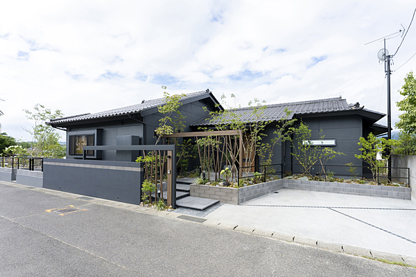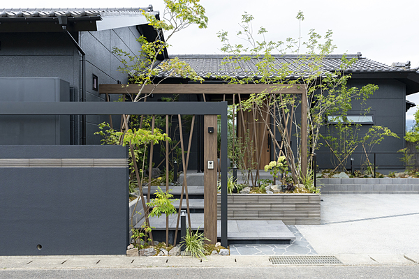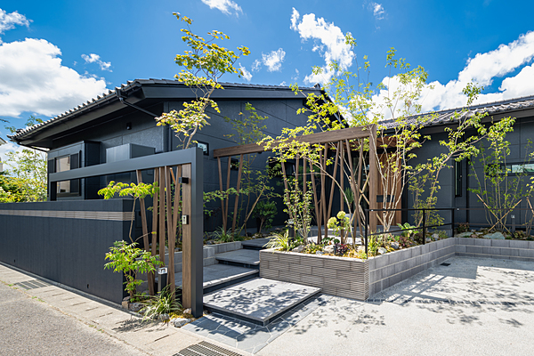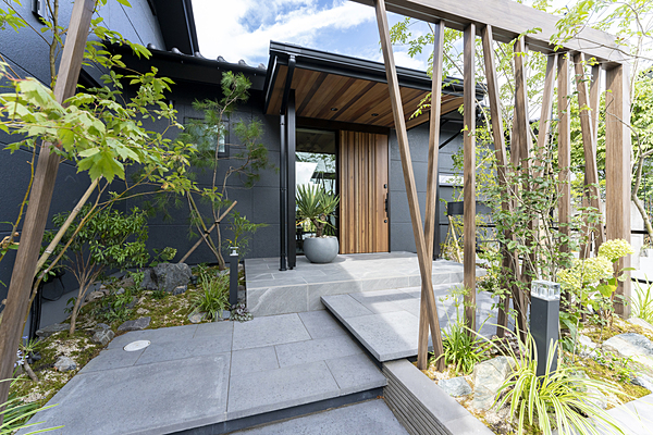 マグストーンペイブで、跳ね出しの階段を廻りこむように作り、段数を増やすことで蹴上を低く施工し、サイズを混ぜて踏み面を広くすることで、歩きやすくデザイン性も高いアプローチになりました。