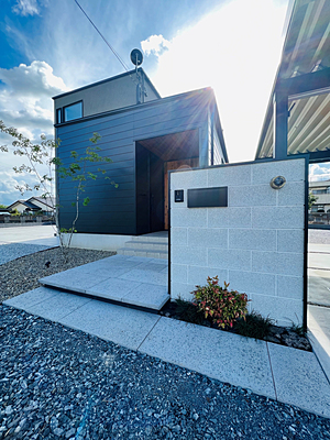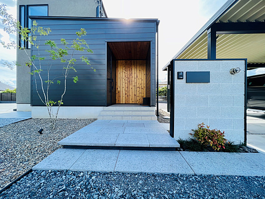 第31回全国施工写真コンテスト 特別賞 アーキテクト+ガーデンデザイン賞詳細はこちら[施工のポイント]展示会で新商品ラファイエを実際見て、勧められて早速プランニングして採用。建物テイストにも合い、黒のアルミ笠置を天端と側面に設置し、メリハリと高級感を出しました。さりげなくアクセントに黒のポスト ソレトとサインを取付け。アプローチには大判のマグストーンペイブでシックに仕上げました。建物との調和の取れた外構に仕上がった作品となり、お施主様にも大変喜んで頂けました。