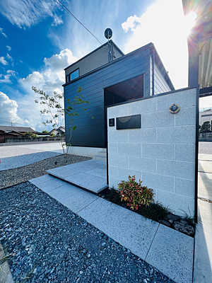 展示会で新商品ラファイエを実際見て、勧められて早速プランニングして採用。建物テイストにも合い、黒のアルミ笠置を天端と側面に設置し、メリハリと高級感を出しました。さりげなくアクセントに黒のポスト ソレトとサインを取付け。アプローチには大判のマグストーンペイブでシックに仕上げました。建物との調和の取れた外構に仕上がった作品となり、お施主様にも大変喜んで頂けました。