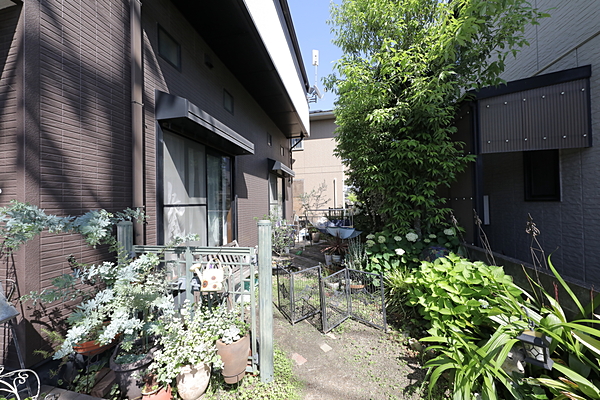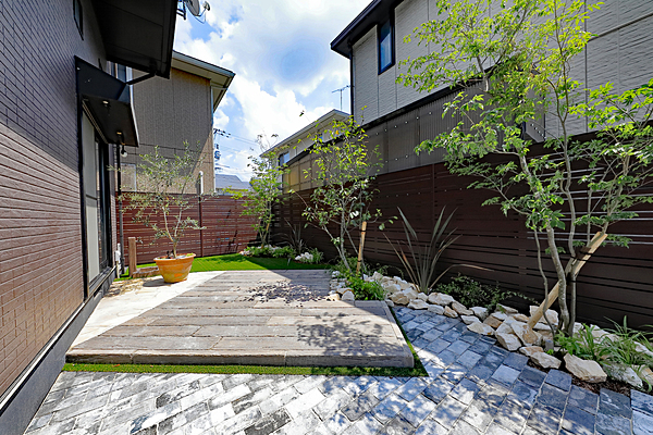 中庭に植えられて何年も経過し大きくなったカシの木と腐食し使えなくなった枕木を撤去し、新たな息吹を。隣地とのプライバシーには板塀を設け、既存のジュラストーン:乱張り石は残しつつ、コンクリート製枕木を再度据え付け、奥側が明るい印象となるように人工芝を敷き、手前にはビンテージレンガそして、お庭の目隠し、そしてリビングからのちょっとした目隠しをレンガ塀でデザイン。また門柱内に植えていたソヨゴも一部が枯れ、育ちも悪い状況でしたので新たにアオダモを植えさせて頂きました。