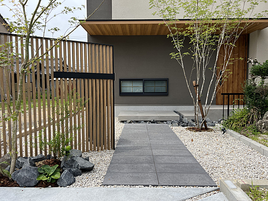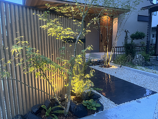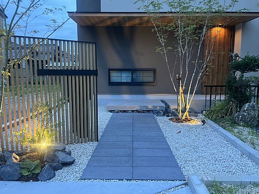 第31回全国施工写真コンテスト 特別賞 インスタグラム賞作品詳細はこちら[施工のポイント]旗竿地の土地を生かし斜めに配置した門と直線できれいなアプローチで奥行のあるデザインに。料亭の入り口をくぐるような趣を持ち、美しい植栽の中を潜り抜けるようにしました。