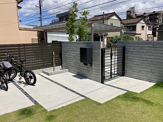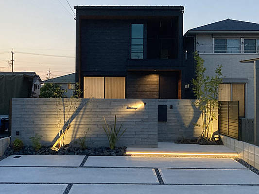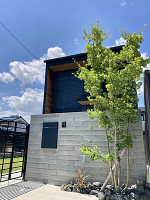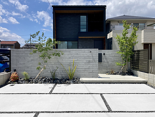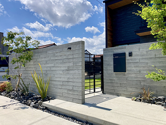 エイジングのムラ感を楽しむ、無骨な格好良さが特徴の建物外壁材に対し、モデリートの質感が心地よく調和する門まわりとなりました。モデリートの明るいグレーはモノトーンのコーディネートとして建物を際立たせ、色鮮やかな新緑・秋の紅葉時のキャンバスとしても一役買っています。土間コンクリートで設えたフロートステップとの相性もよく、昼には植栽の影が、夜にはライトアップによる陰影が美しいエクステリアとなりました。