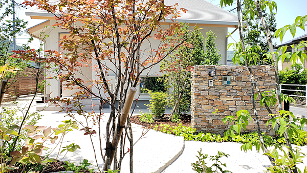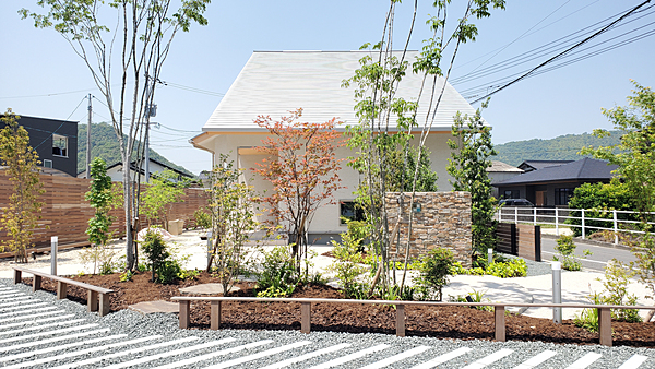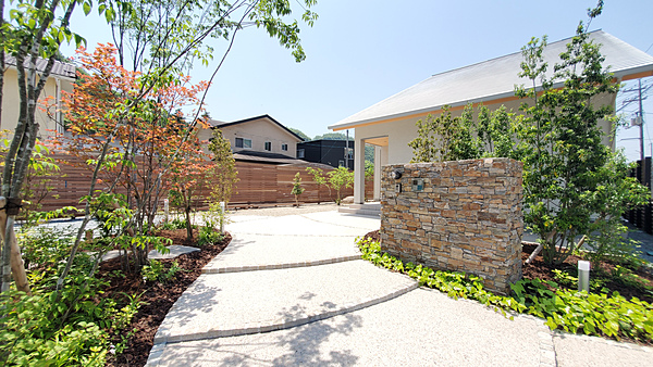 【3世代が安全に楽しめるお庭】ご夫婦とお子様で暮らすお施主様に、お隣がご実家という環境でした。玄関から道路への動線を長く取り、お子さんが道路に飛び出ないようにアプローチを設けました。おじいちゃんおばあちゃんがお孫さんによく会いに来られる為、アプローチの蹴上を低く緩やかにして歩きやすいようにしています。また夜になっても、足元を明るく照らすポールライトを設置しております。3世代が仲良く安全に安心して集える空間となるといいなと想い、設計致しました。