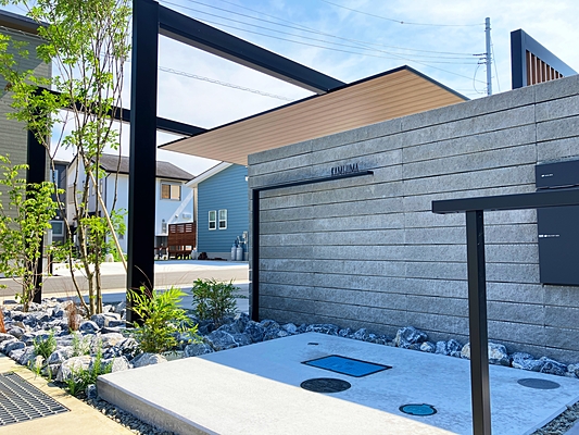 建物アクセント壁にあわせてナチュラルな割肌テクスチャーを持つ素材を門柱に使用し、門柱を基準に手前が来客用で奥が施主の2つのアプローチを演出しました。