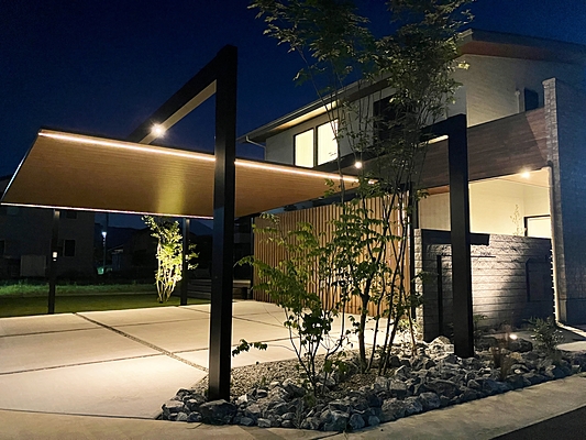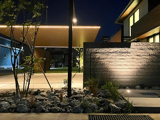 自然石の表情が持つ重厚感と植栽が、ファサードエリアをより引き立ててくれました。