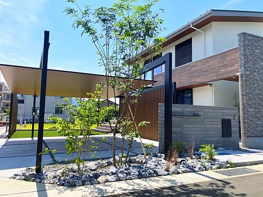 [施工のポイント]建物アクセント壁にあわせてナチュラルな割肌テクスチャーを持つ素材を門柱に使用し、門柱を基準に手前が来客用で奥が施主の2つのアプローチを演出しました。自然石の表情が持つ重厚感と植栽が、ファサードエリアをより引き立ててくれました。