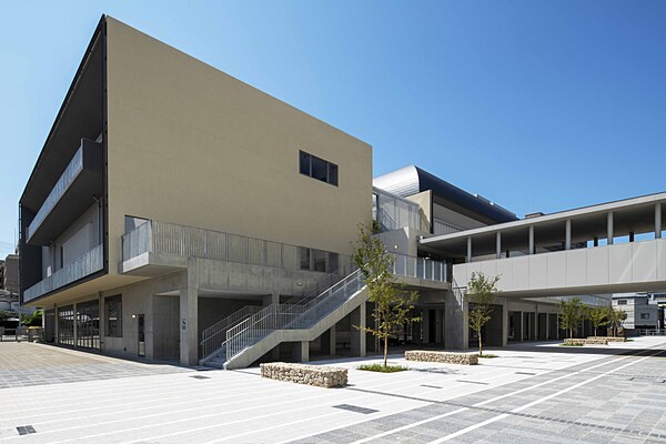 音楽科のある学校なので五線譜をイメージし、白を基調としたラインを配置した間に黒のブロックで校歌を模した音符を配置しました。正門からのアプローチで、学校のイメージを出せた施工が出来たと思います。なおグラウンド側は、アースカラーを基調としたデザインで施工しました。この学校のカラーを出せた仕上がりになりました。
