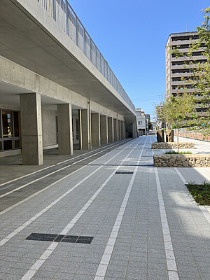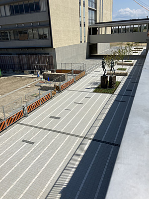 第31回全国施工写真コンテスト パブリックスペース部門 優秀賞作品詳細はこちら[施工のポイント]音楽科のある学校なので五線譜をイメージし、白を基調としたラインを配置した間に黒のブロックで校歌を模した音符を配置しました。正門からのアプローチで、学校のイメージを出せた施工が出来たと思います。なおグラウンド側は、アースカラーを基調としたデザインで施工しました。この学校のカラーを出せた仕上がりになりました。